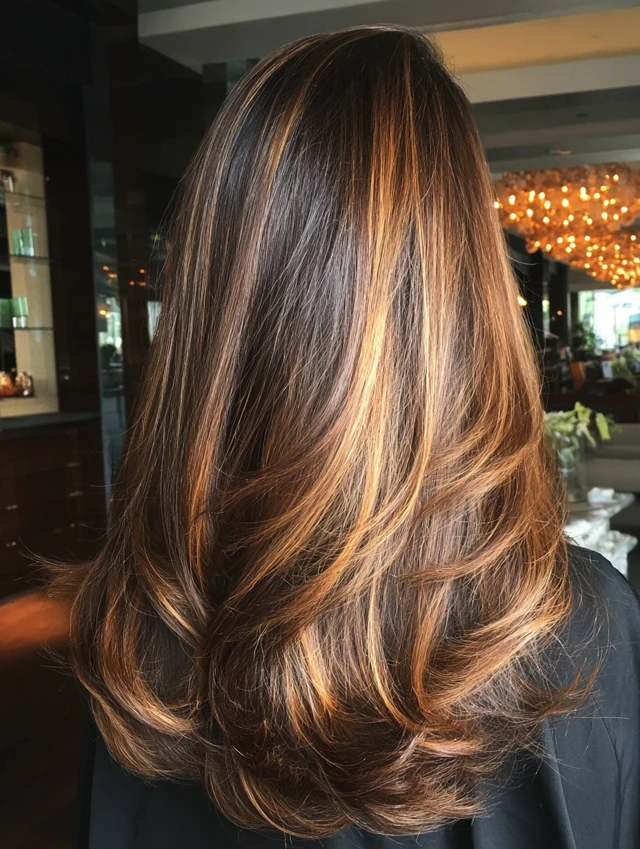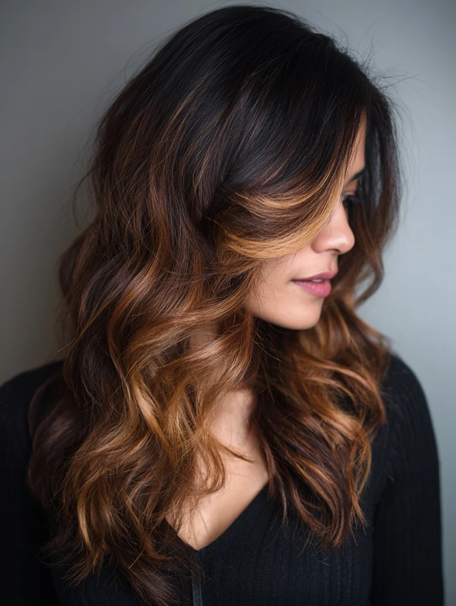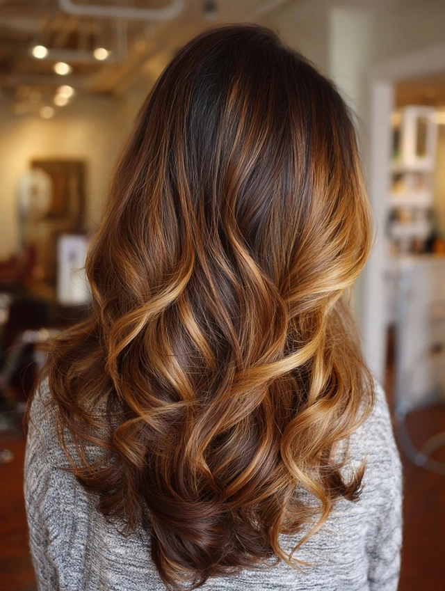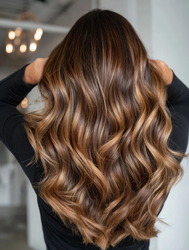 Caramel balayage creates a sun-kissed, glowing effect on darker hair — a natural, warm look that transitions beautifully into summer.
