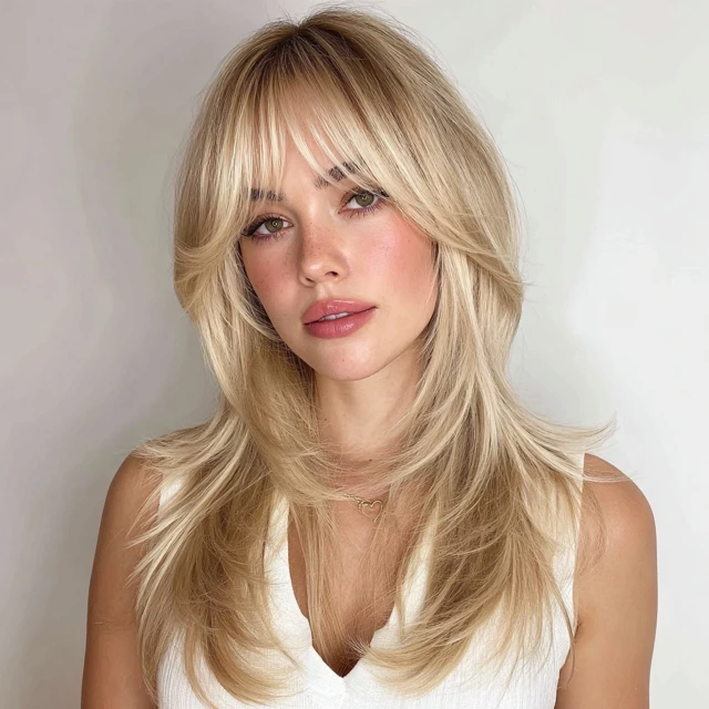 Why It Works: This combo brings softness and symmetry to your look. The bangs flow seamlessly into the longest layers, highlighting your cheekbones and jawline. It’s romantic, flattering, and works for almost any face shape.