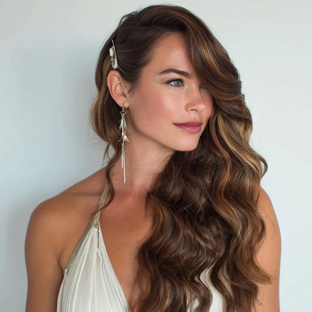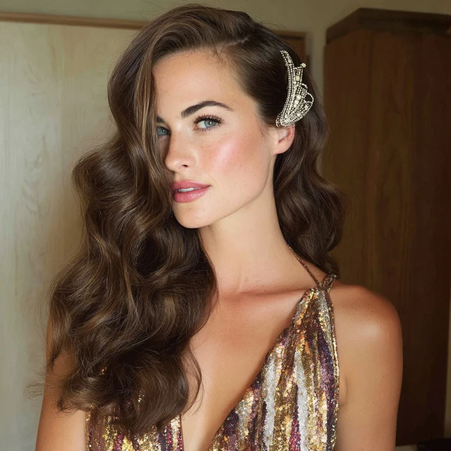 Why It Works: Sweeping hair to one side instantly creates drama and depth, while an accessory adds sparkle and structure.