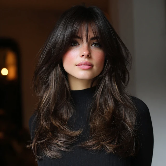 Why It Works: Layers keep the bulk manageable, while curtain bangs frame your face beautifully. It’s trendy yet versatile—perfect for thick hair.