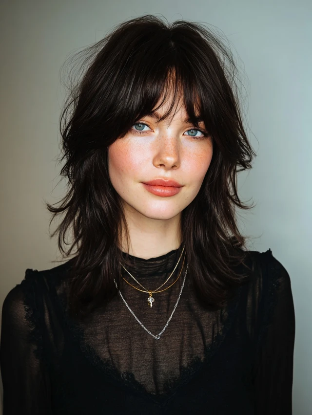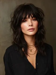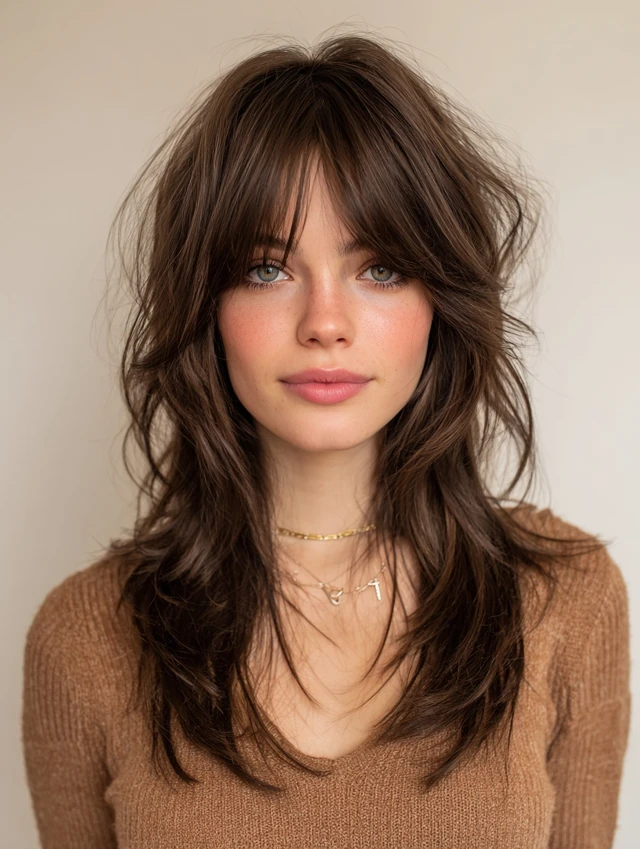 A shag adds texture and volume, while curtain bangs soften the overall look.