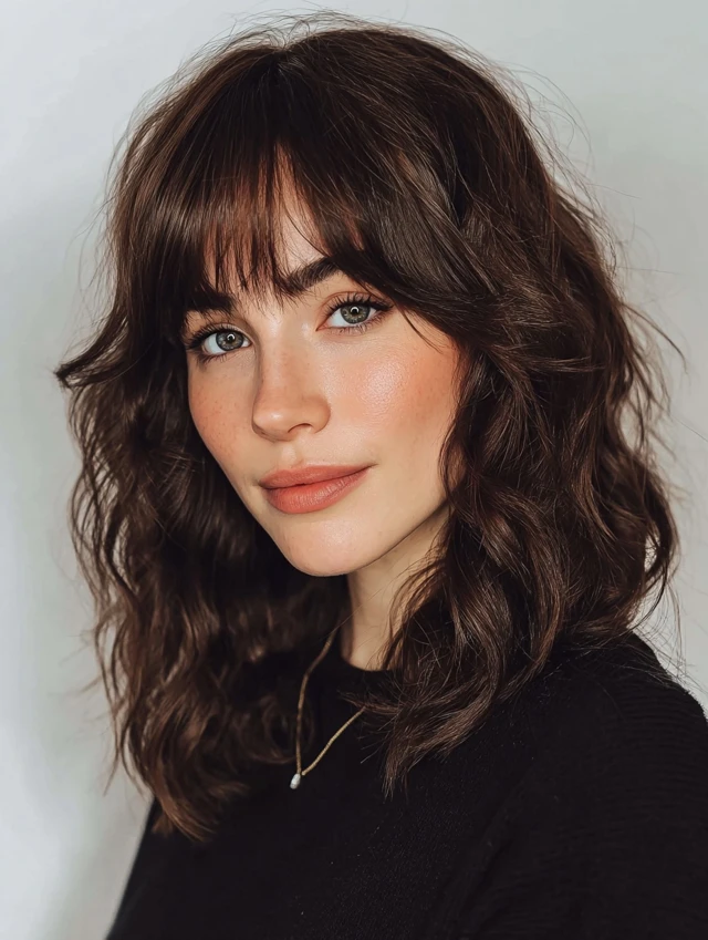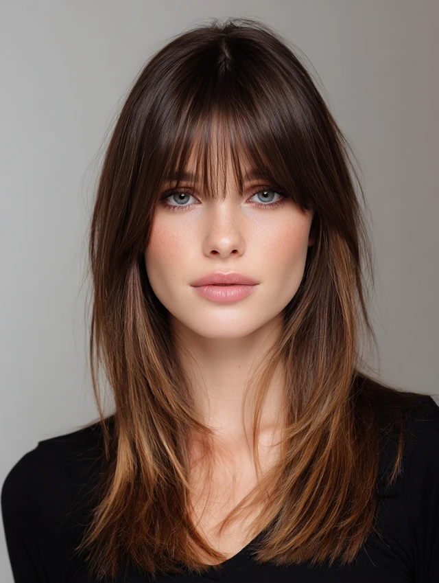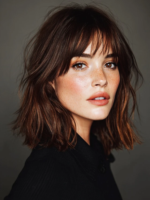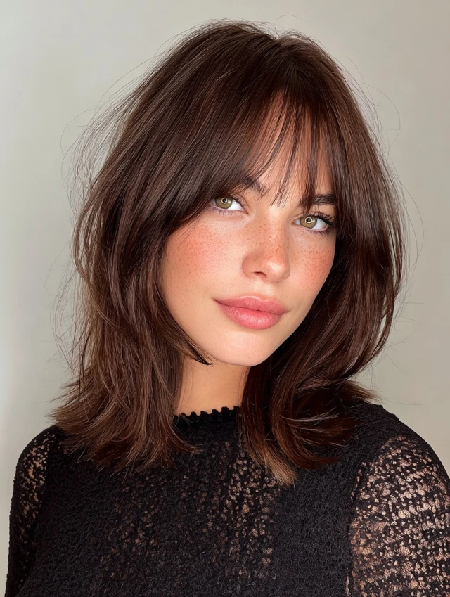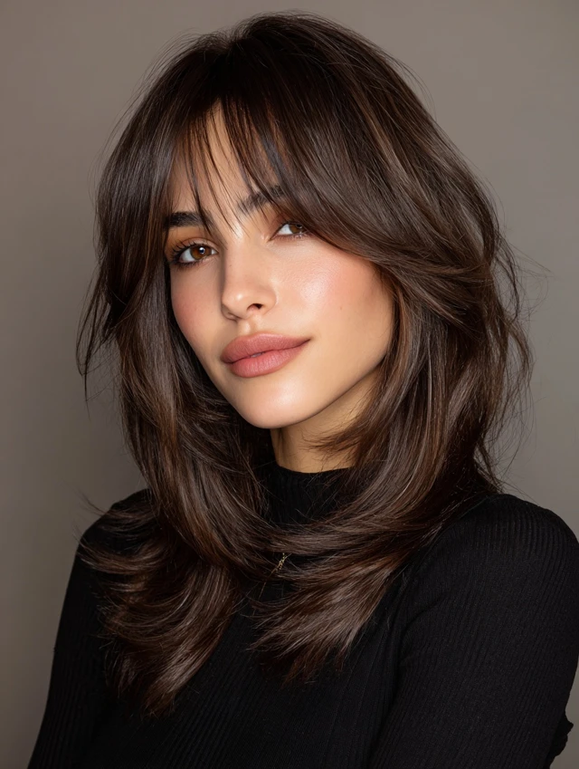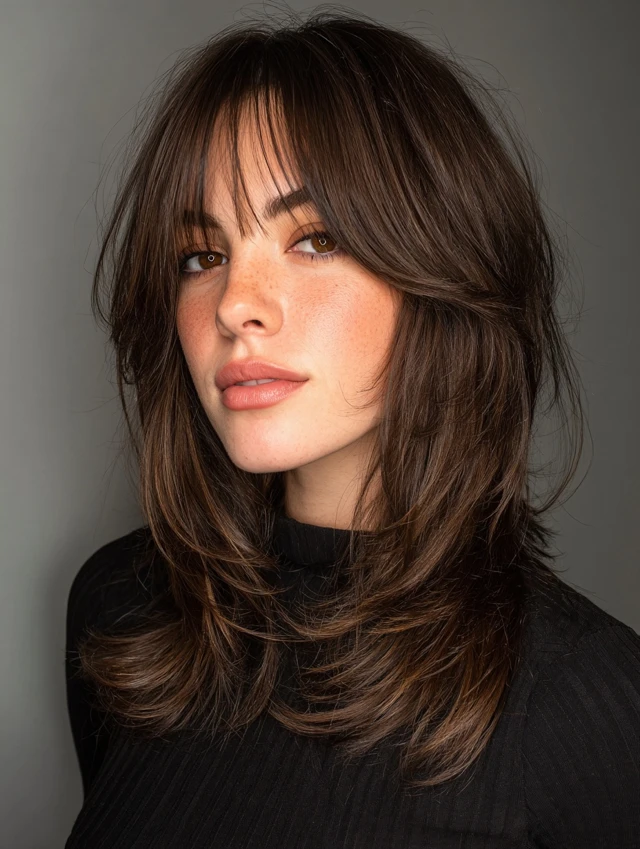 Soft layers add movement, while curtain bangs highlight the eyes and cheekbones.
