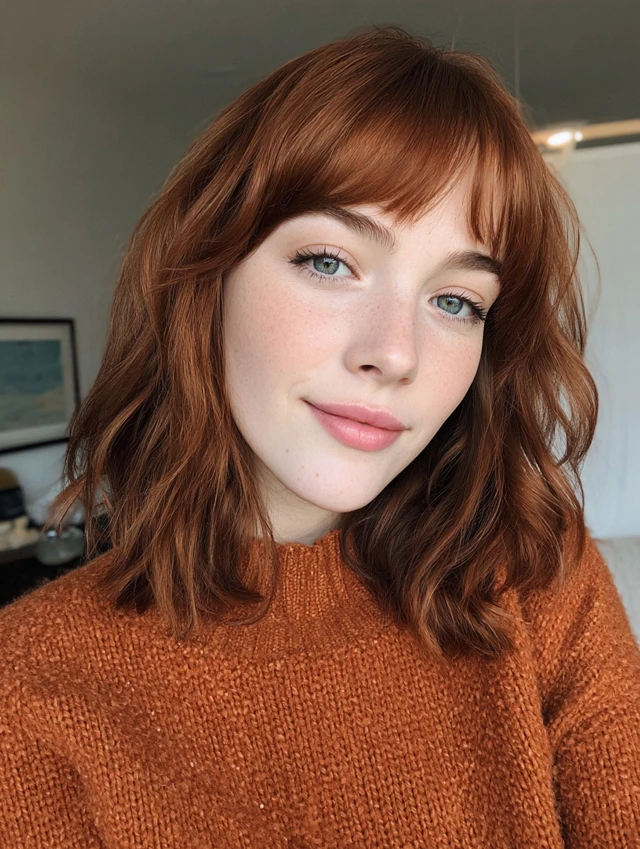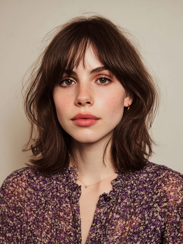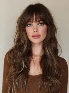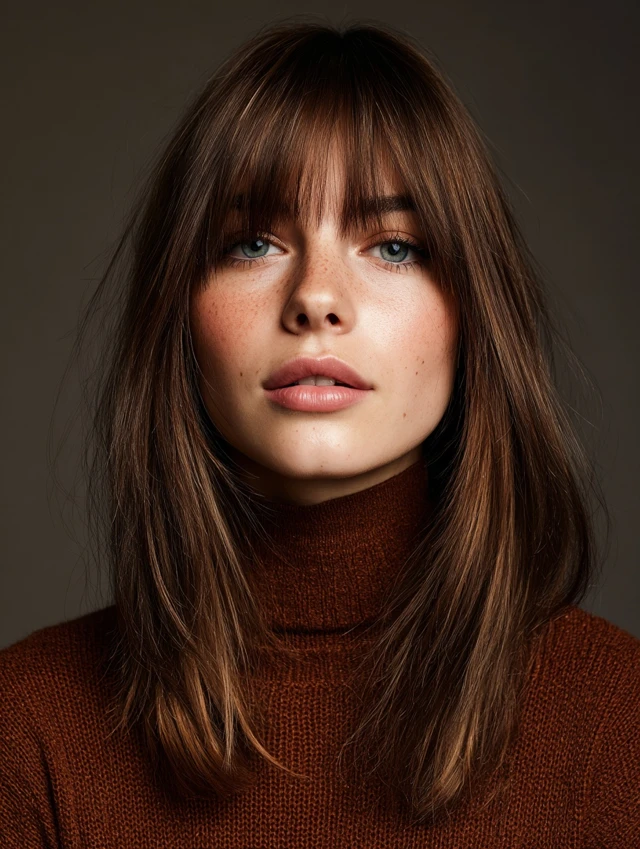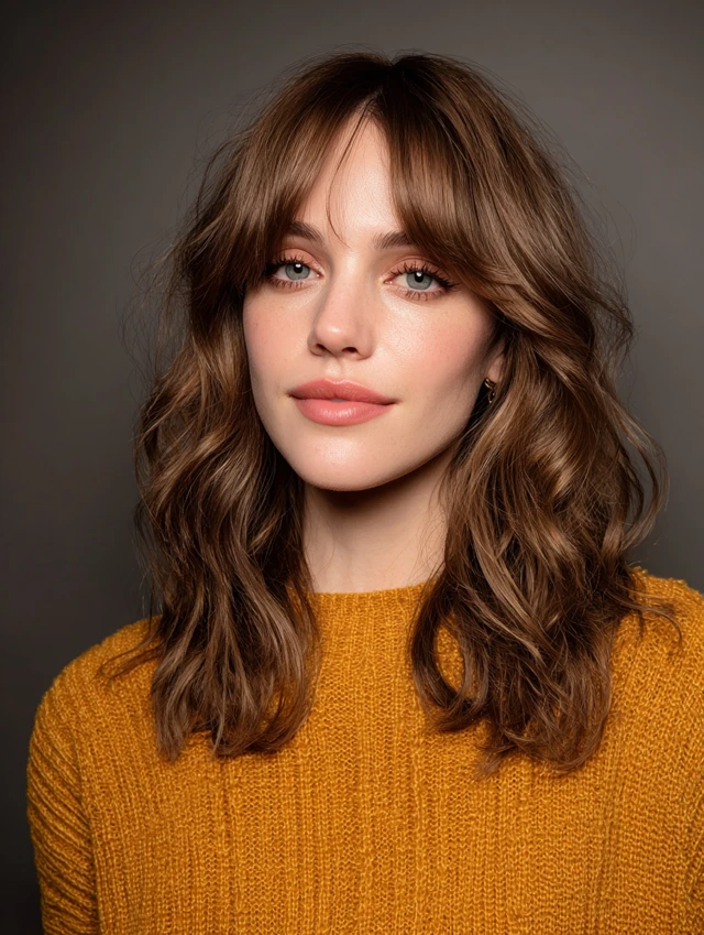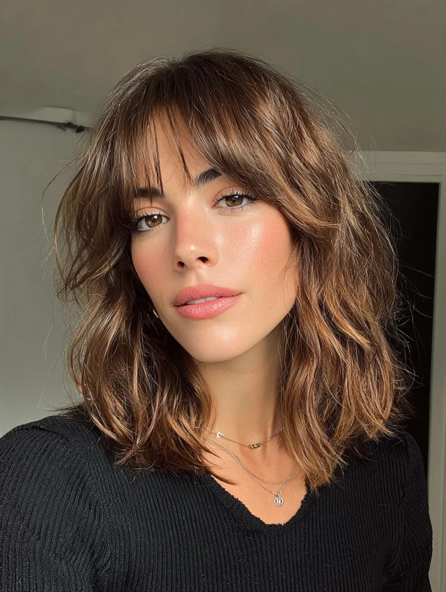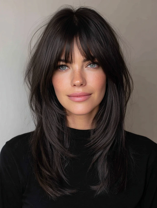 Soft layers add movement, while curtain bangs highlight the eyes and cheekbones.