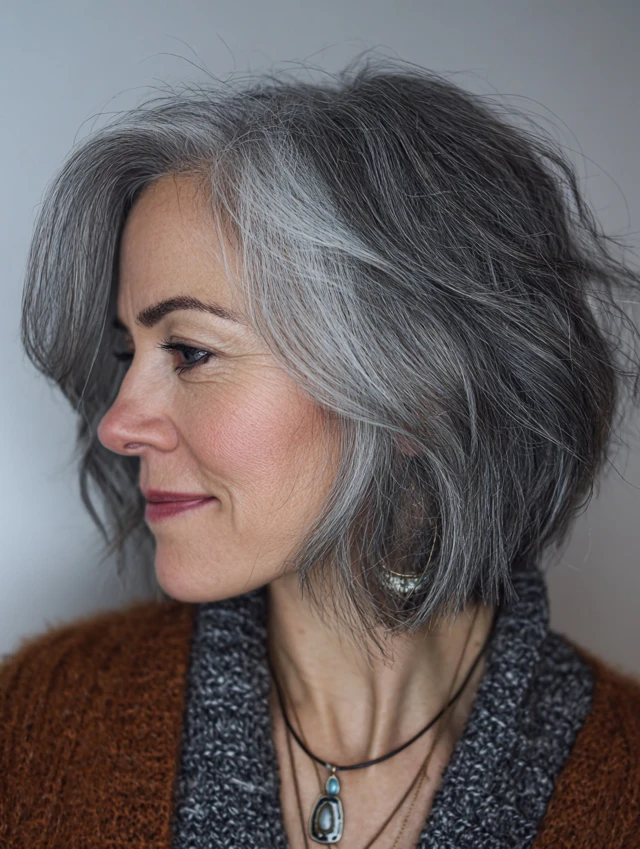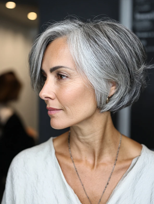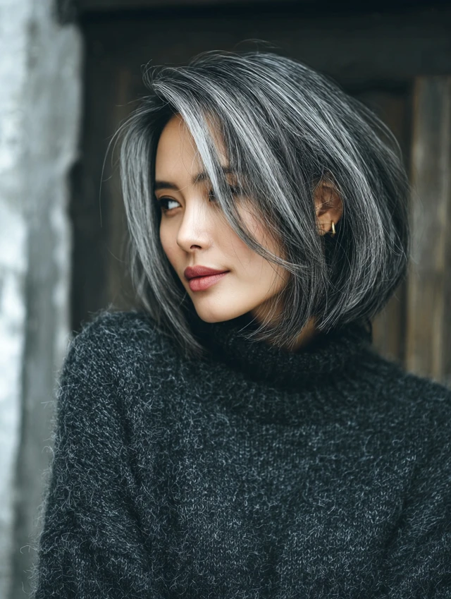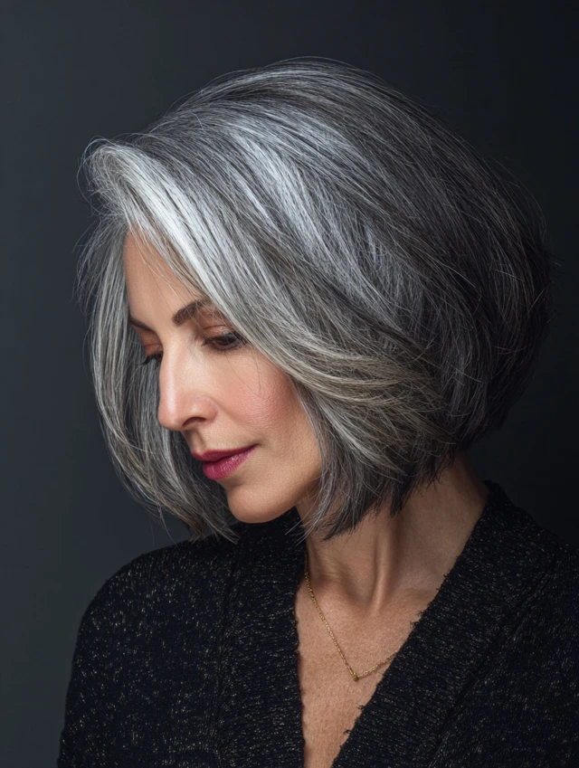 Why It Works: The bob adds structure, allowing the natural contrast of salt and pepper hair to stand out beautifully.