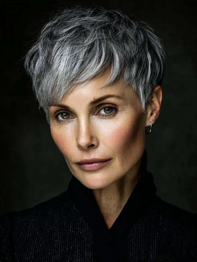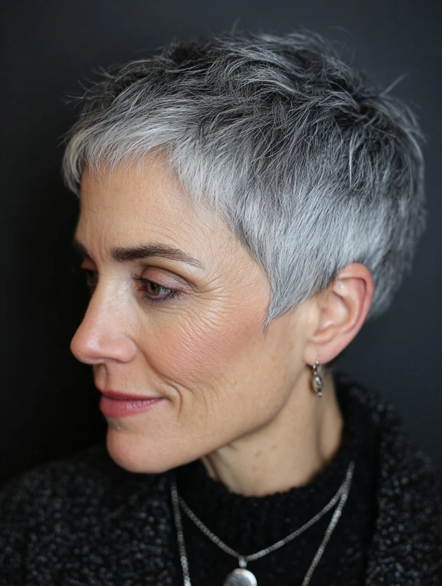 Why It Works: A pixie highlights facial features and makes salt and pepper tones look bold and intentional.