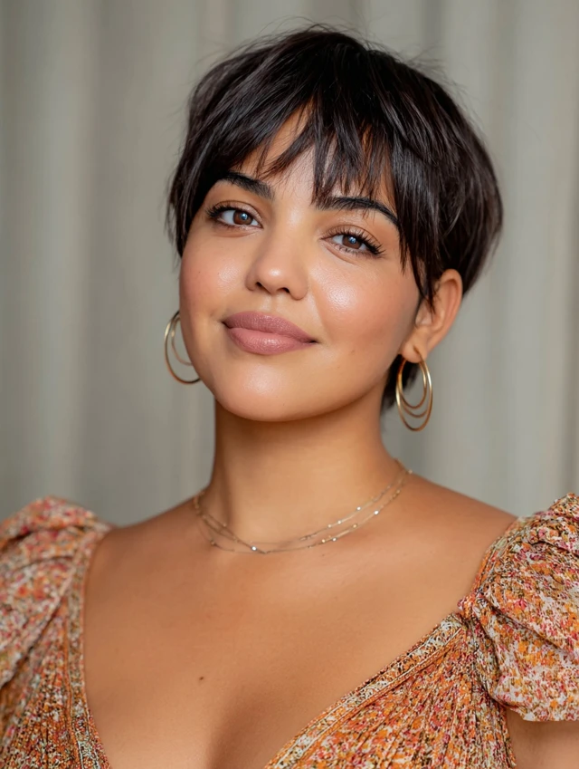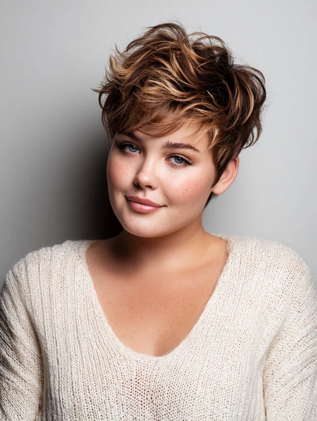 Round, fuller faces often have soft cheeks and gentle curves. The right short hairstyle helps by adding vertical lines and avoiding width at the sides.